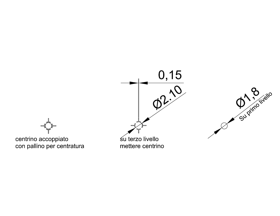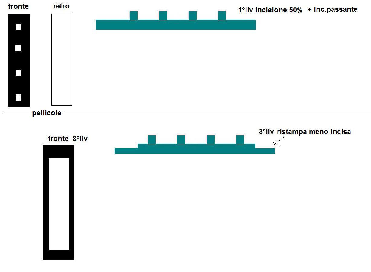 La lastrina prima verrà normalmente incisa con la tecnica della fotoincisione passante a 2 livelli.Poi sulla lastrina ottenuta, si applica una terza pellicola (solo frontale, poichè la parte posteriore verrà protetta dal fotoincisore).La terza pellicola verrà centrata ad occhio, quindi bisognerà disegnare su ambo i livelli dei centrini di allineamento.Questa tecnica è ottima per disegnare modanature imbullonate su fiancate/cassa di rotabili o altro.I migliori risultati, se si è particolarmente esigenti, si raggiungono dopo qualche prova.