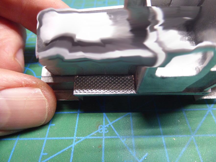 Il suggerimento economico e facilissimo che qui voglio lasciare, riguarda la realizzazione del problema per i rotabili , in particolare le locomotive , che presentano i praticabili antiscivolo zigrinati ; non le ho mai viste ma sicuramente in commercio esistono costose fotoincisioni per dettagliare meglio i modelli ; io penso che si possa evitare rapidamente tale scelta in questo modo : avete visto che faccio uso del nastro adesivo di alluminio per idraulica, con un alto potere aderente ...tutti noi possediamo comunemente però un tagliabalsa o bisturi che usiamo continuamente, se lo osserviamo ha il manichetto zigrinato ( viene realizzato in se industrialmente al tornio con un utensile , il " goffratore ", il mio tornio non me lo permette ) . Se lo premiamo a forza sul nastro di alluminio sul tavolo, meglio se su classico tappettino verde da modellista o superficie non troppo dura e lo facciamo riotolare con un piano di ferro , ne otteniamo il ricalco a volontà del manichetto, quindi zero spesa ottima resa, e ne lascio un esempio su di un praticabile di una mia locomotiva ora in costruzione ( non vi dico quale, la foto l'ho rovinata appositamente , :D , scusatemi, lo vedrete..) quindi otterremo piccole porzioni da ritagliare a misura secondo nostra necessità ; troviamo al vero lamiere zigrinate anche su tombini, piccoli gradini di rotabili , marciapiedi o altro calpestabile ; ribadisco l'utilità grandissima di questo nastro, utilissimo in mille occasioni, vi toglie dagli inconvenienti e fastidiose difficoltà rapidamente e soprattutto invisibili a modello completato, oltre la possibilità di rivettare un modello o creare grigie di aerazione sempre difficilissme altrimenti, basta tracciare con precisione senza calcare troppo, perchè attenzione, se premiamo oltre un certo limite , il nastro si taglierà , per questo evitiamo punte troppo appuntite e mai tenute in senso verticale ! Poi anche possiamo anche rimediare alle fastidiose fessure . :D