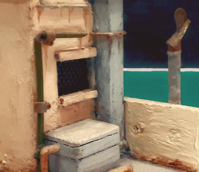 Inoltre giochi di colore che risaltano le perdite dei vecchi tubi arrugginiti che vanno a macchiare le pareti, così come le macchie di ruggine sul comignolo a sezione quadra dovute ai
