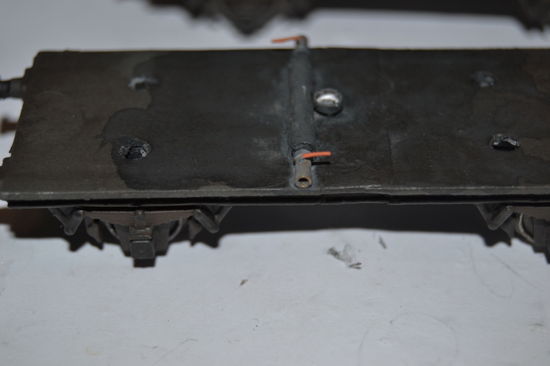 Ovviamente chiusi i due fori di innesto cisterna dal lato “praticabile freno”, in quanto non più utilizzabili e ne riaprii altri a distanza corretta. Incollai anche un pezzo di tulle da confetti per emulare la zigrinatura del piano del praticabile.