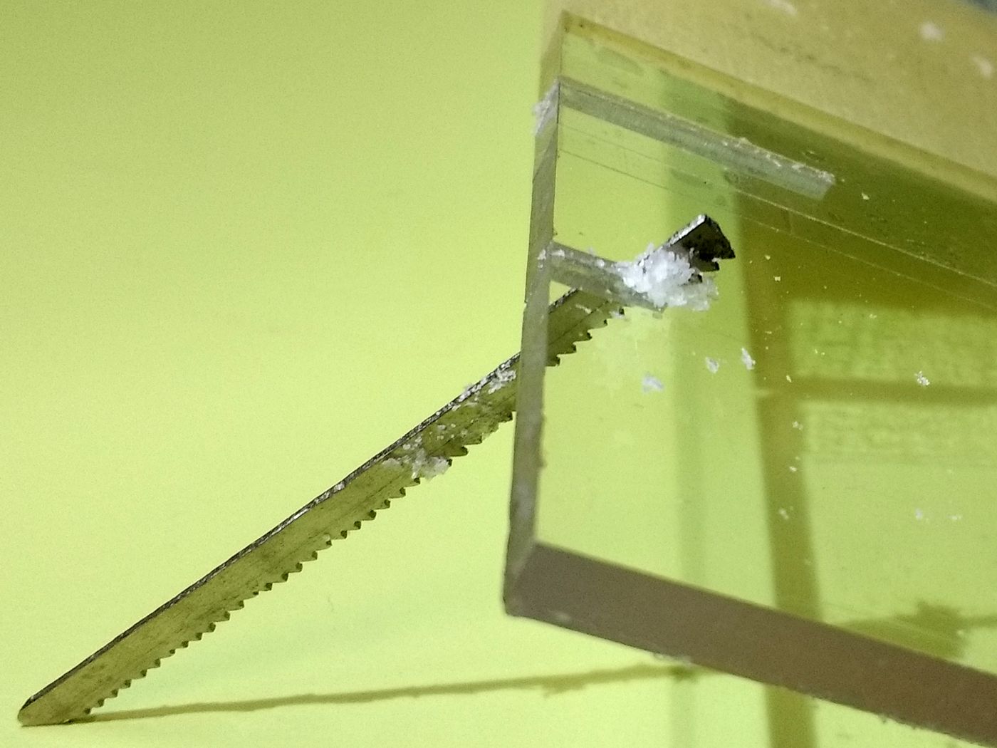 Una nota riguardo il taglio del policarbonato col seghetto alternativo: è necessaria la presenza della sua pellicola protettiva sul lato superiore (dove escono i trucioli), altrimenti si forma una bava fusa che grippa la lama. Nella foto sotto ho fatto diversi tagli di prova. In sequenza da destra: uno con la sua pellicola, poi con il nastro di carta, quello trasparente da cancelleria e infine senza nastro, con la lama grippata e spezzata (ho visto che col policarbonato quando è lunga si spezza molto facilmente).