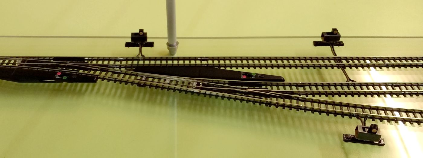 Questo è un particolare dei due doppi deviatori che gestiscono il cappio. Oltre a quello solito, ce ne ho messo un altro, che taglia l'alimentazione al ramo non scelto, per evitare corti accidentali con le locomotive (con l'incrocio inglese all'ingresso della stazione mi sbaglio spesso):