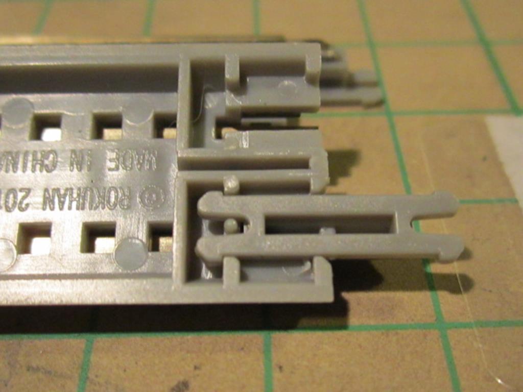 Nella parte inferiore sono presenti 2 cilindretti con la parte centrale cava per permettere l'inserimento di una punta da trapanino, ma grazie allo sottile spessore della massicciata basta una puntina da disegno con piolo per perforare il sottile strato in plastica. Una volta creato il foro potremo inserire la vite o il chiodino ( stranamente non ho trovato la referenza Rokuhan, appena riesco provo con chiodini in N o HO delle comuni case )