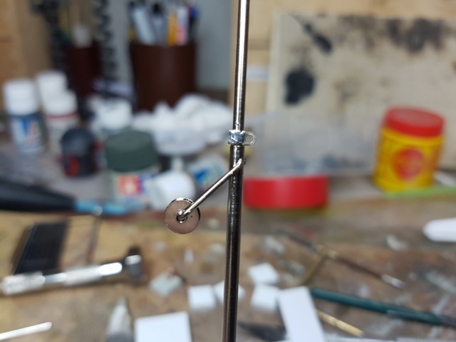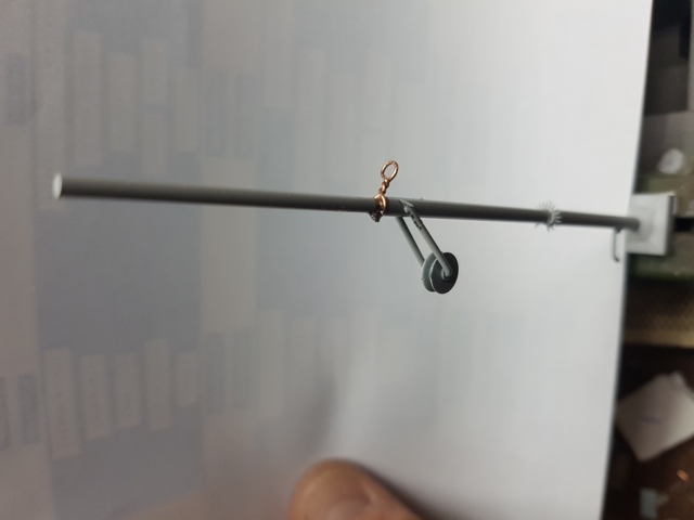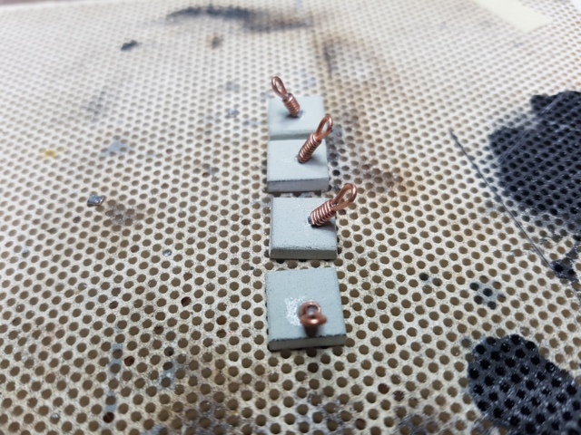 Per quanto riguarda i pali di ancoraggo e tiraggio della linea aerea hanno sugito ulteriori modfiche: l'attacco autocostruito del cavo di fissaggio del palo è stato sostituito con due asole in fotoincisione, moltopiù vicine al reale, provenienti da pezzi avanzati da vecchi kit . Inoltre è stata aggiunta l'asola isolata alla quale va ad agganciarsi il filo di guardia (credo si chiami così), quello superiore al filo di contatto.