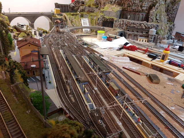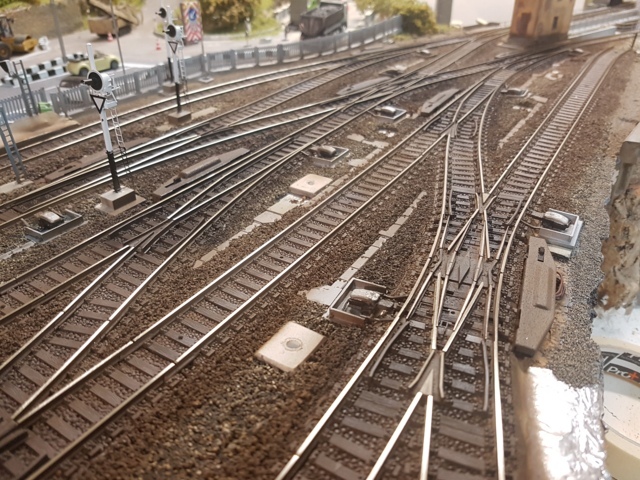 Per quanto riguarda la massicciata vorrei evidenziare che non è costituita dalla classica graniglia bensì da graniglia di granturco leggerissima e molto facile da incollare e scollare, all'evenienza. un ulteriore vantaggio è che la si può colorare durante le fasi di incollaggio, basta mescolare il colore voluto alla miscela di acqua e vinavil. E' molto interessante e pratica e soprattutto non pesa nulla e non aumenta il rumore di fondo del treno durante il transito.