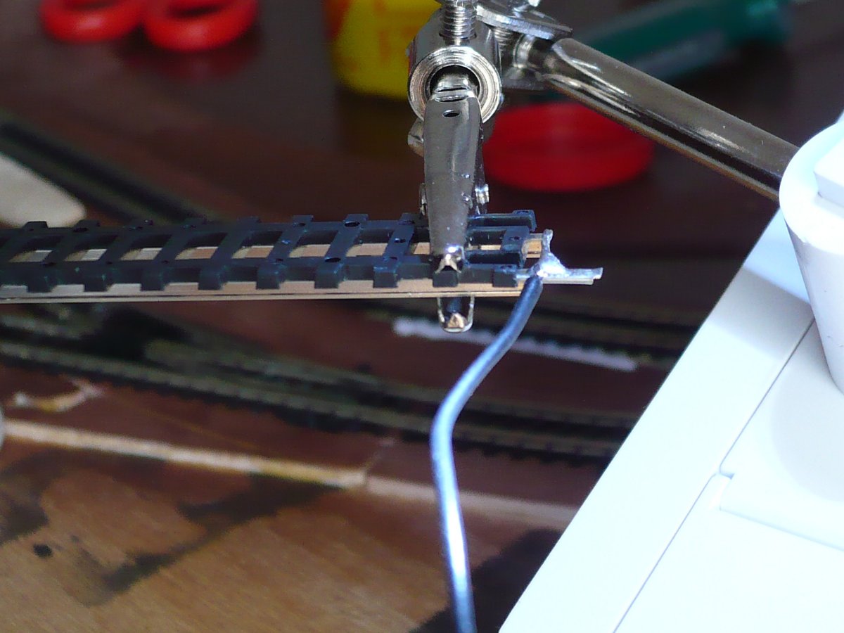 Per questo ho un'altra bella foto da mostrarvi: Quest'altra è veramente brutta/sfuocata, ma potrebbe far vedere altri particolari (scusate): Avrei voluto saldare direttamente, i punti di contatto, sulle rotaie, ma visto l'esiguo spazio ho avuto paura di colare la plastica delle traversine ed ho optato per le scarpette; ne metterò il più possibile.