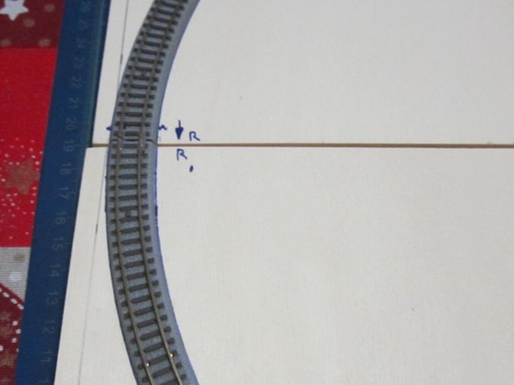 Dopo aver tracciato le linee a 7 mm dal bordo esterno ho posizionato i due binarvi curvi in modo che i due spigoli esterni della massicciata combaciassero sulla line e quindi tracciato la sagoma.
