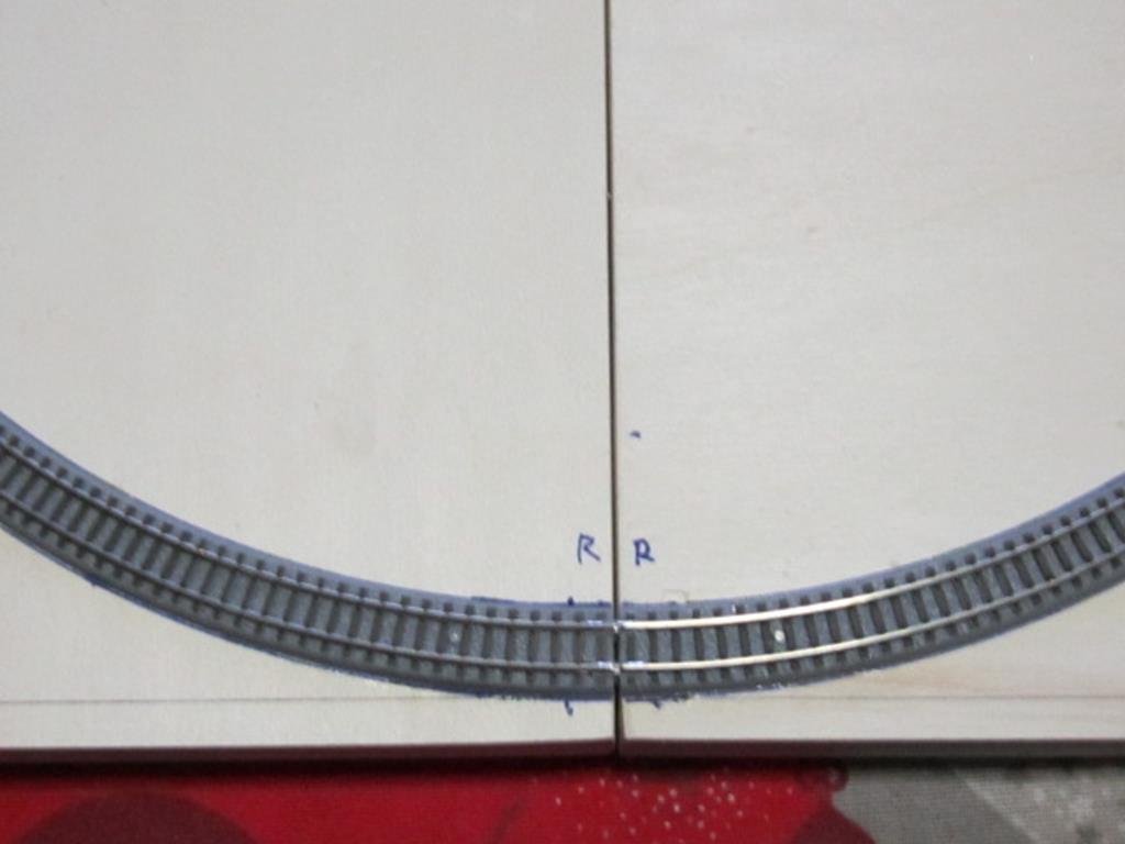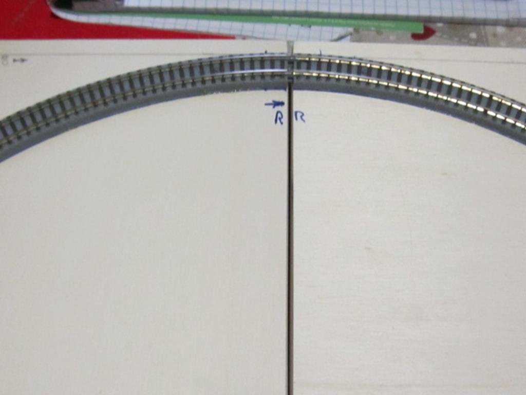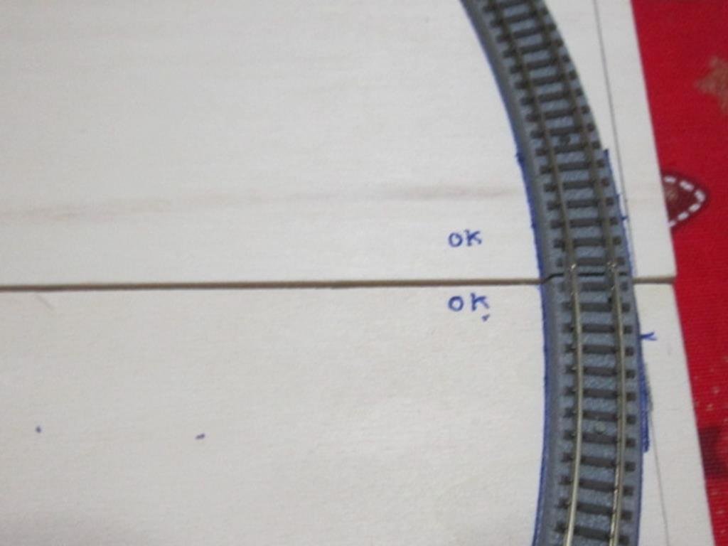 Dopo aver tracciato le linee a 7 mm dal bordo esterno ho posizionato i due binarvi curvi in modo che i due spigoli esterni della massicciata combaciassero sulla line e quindi tracciato la sagoma.