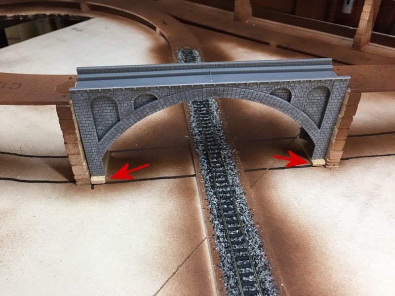 qui dove vedi la freccia c'è un distacco di qualche mmPoi non ho capito cosa intendi per chiudere lo spazio sotto il binario , quale spazio?E non ho nemmeno capito perchè tenere i piloni più distaccati per compensare il distacco.