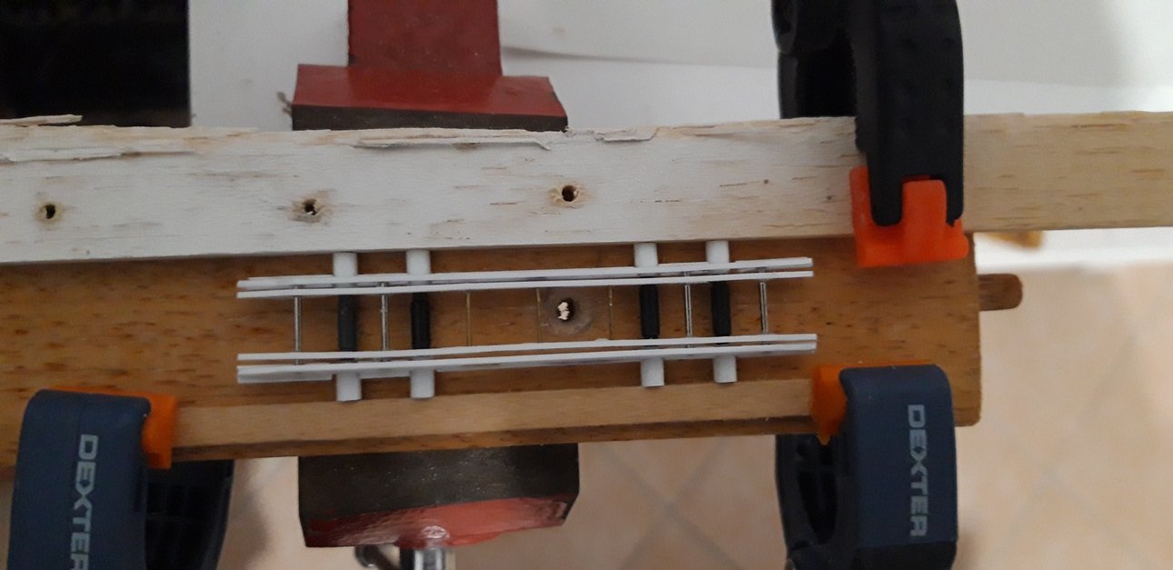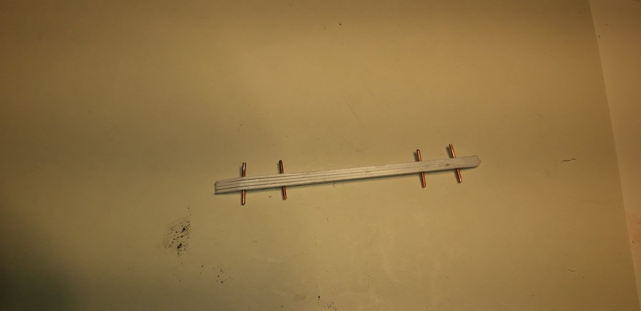 Lasciando i 2 pezzi centrali aderenti fra loro ho praticato 3 fori da 0,5 mm equi-distanti, al centro e gli ho incollato un tondo in ottone da 0,5 mm che li portasse ad una distanza fra loro di 10 mm.