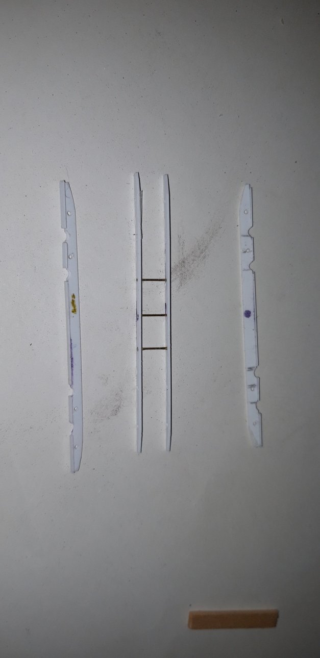 Dopo aver staccato i due profili esterni li ho sfilati dai perni fittizzi e gli ho incollato, nella parte inferiore, fra una limata e l'altra dei profili evergreen angolari da 1x1 mm, lascando libere le limate.