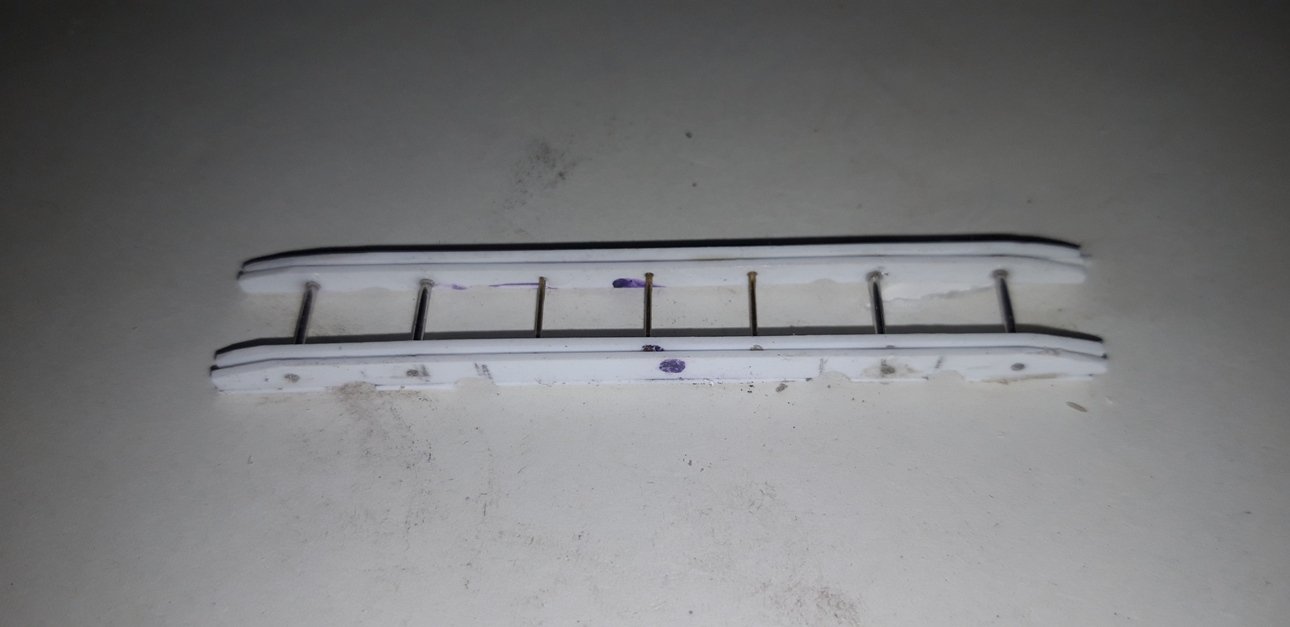 Lasciando i 2 pezzi centrali aderenti fra loro ho praticato 3 fori da 0,5 mm equi-distanti, al centro e gli ho incollato un tondo in ottone da 0,5 mm che li portasse ad una distanza fra loro di 10 mm.