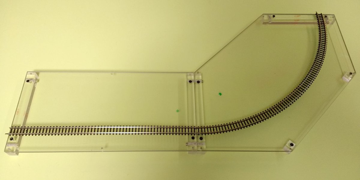 La geometria è un po' diversa dai Deister-Dielen XS: il modulo curva è da 220x220 mm e conseguentemente, in quello rettilineo da 220x110, il binario ha l'asse distante 25 mm dal bordo.