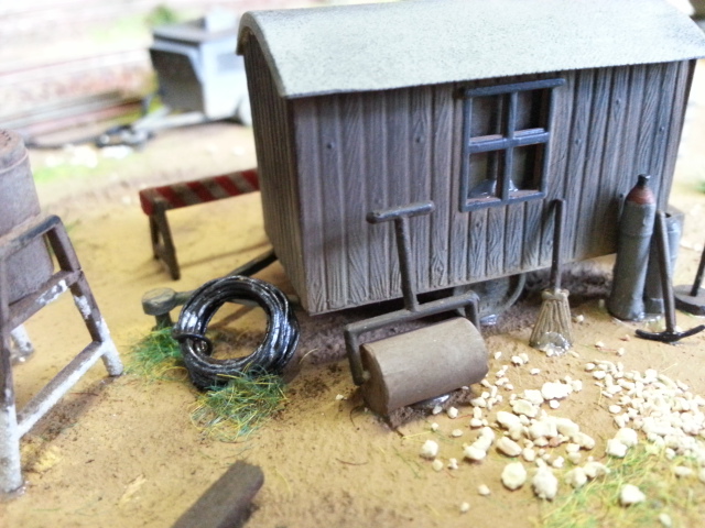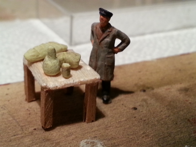 aggiornamento diorama operativo scalo merci fs como lago: finito il bidone con il fuoco creato con un led, aggiunta anche una matassa di filo di ferro fatta con filo d'ottone , e finito anche il tavolo con pane fiasco di vino e altro, creati con il milliput, mi sono venuti un pò grandi ma è la prima volta che uso il milliput e comunque sono oggetti veramente piccoli difficili anche da modellare.