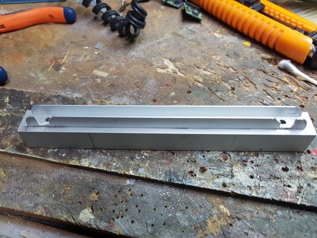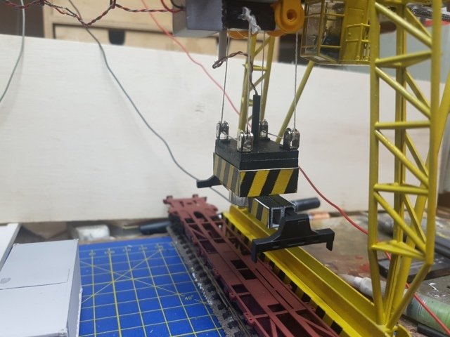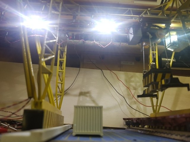 Il cablaggio è all'interno di piccoli tubicini di evergreen appoggiati ad uno dei piloni della gru. Grazie a ciò ho su di un carrello i due motori atti per il movimento sui binari N alimentati in analogico, sull'altro carrello ho una alimentazione digitale per l'alimentazione dei due decoders atti al funzionamento dei due motori sul ponte e di tutti gli altri servizi. I decoders trovano alloggiamento un appositi spazi fresati su i due carrelli realizzati in profilato di alluminio.
