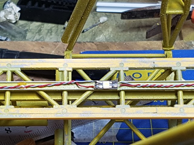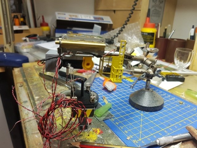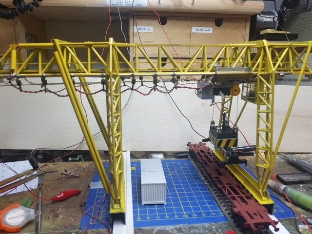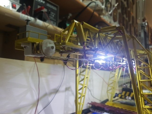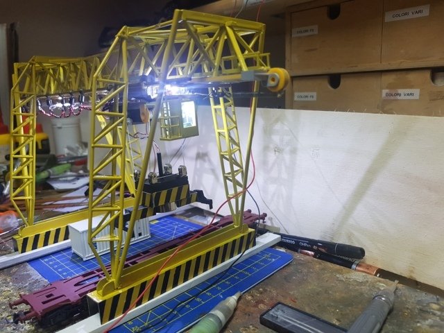 Ieri sera ho assemblato la struttura della gru e tutti i servizi con tutti i relativi cablaggi sono al loro posto e funzionanti. Il funzionamento al momento è stato testato solamente in modo analogico, ma la struttura è stata appositamente modificata e cablata per poter passare agevolmente, spero, al funzionamento digitale. Ora per me arriva il momento più difficile perchè devo mettere mano alla parte elettrica e digitale (resistenze, assorbimenti vari, ecc.). Ma non dispero, un passo alla volta. Mi ricordo ancora quando durante lo scorso Novegro parlavo del progetto con Ed e non è detto che il tutto possa concludersi proprio al prossimo Novegro con i suggerimenti di ED e l'impiego di Arduino.