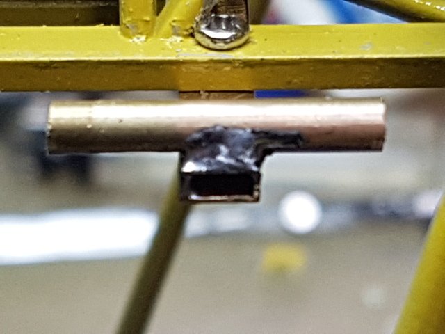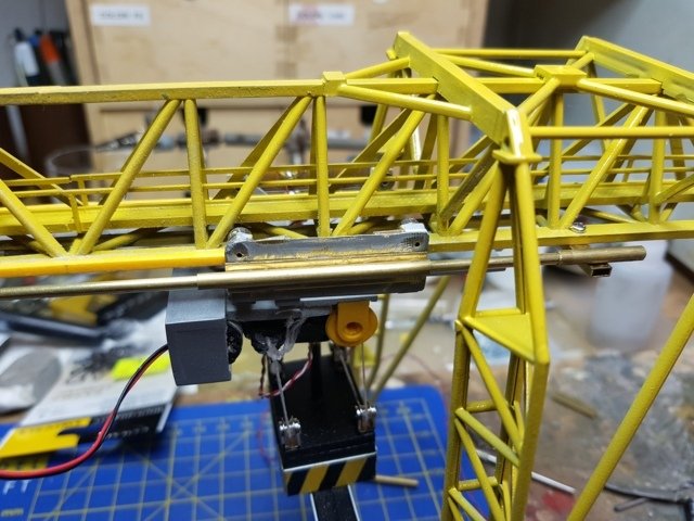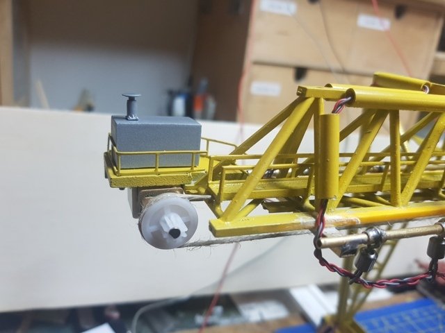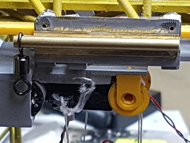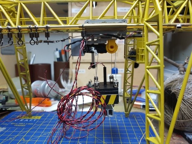Il carrello che sostiene il "ragno di sollevamento/abbassamento" è la parte fondamentale e quella dove ho lavorato maggiormente. A parte la costruzione del supporto per il motore con riduzione angolare a 90°, i problemi da affronatre sono stati quelli relativi allo scorrimento sulla travatura centrale e l'alimentazione dei vari servizi concentrati sul carrello assicurando nel contempo il libero movimento. Alla fine la soluzione migliore è stata quella di copiare la realtà: cioè quella di far scorrere i fili lungo la corsia del carrello. Due tubicini di ottone uno dentro l'altro sono serviti perfettamente allo scopo, anche se il loro posizionamento mi abbia fatto impazzire in quanto saldati a stagno tra di loro e fissati con viti e bullone da 1 mm alla struttura portante della gru, in plastica.