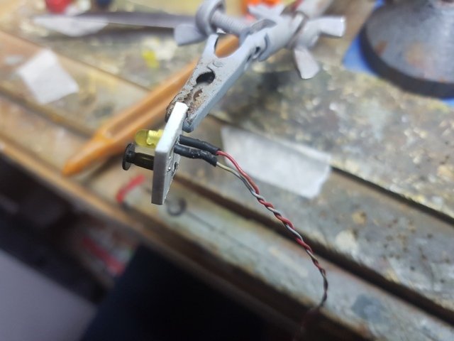 I fari per l'illuminazione sotto il ponte sono dei led saldati su piccole tracce di materiale stagnato collocate successivamente in un profilato ad "C" posto sotto la travatura centrale della gru.