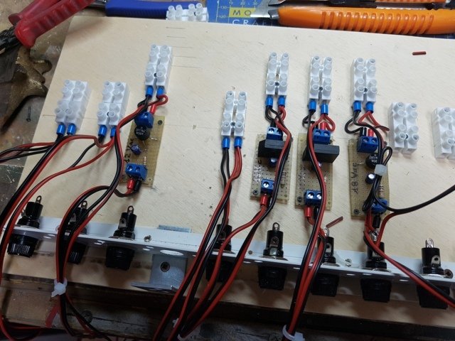 In alto i led di funzionamento delle utenze da 3Vcc x2 lineee 12 Vcc e Ac 16 VAc x 2per i decoder scambi e 18VAc + una di riserva.