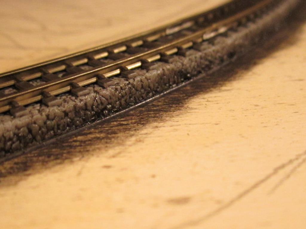 prima ho ripreso gli spigoli della massicciata con un grigio chiaro con la tecnica del pennello secco per ricreare i volumi, secondariamente sono state riprese le traversine con un marrone scuro. In questa fase sono stati utilizzati i colori della Life Color sempre opachi ma ottimi per l'utilizzo con i pennelli Una volta che queste colorazioni saranno asciugate verrà passato un film di colore ad aerografo per armonizzare il tutto e rendere meno rossiccio, sono indeciso se utilizzare un grigio chiaro o un sabbia vedo poi cosa scegliere