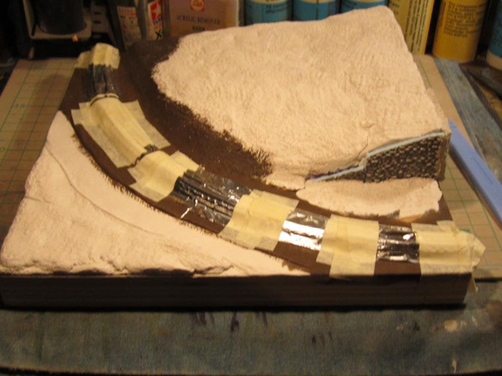 Ma si può fare grazie alle massicciate in plastica dei binari che non si sgretolano come il ballast a contatto della parte adesiva del nastro. Con il ballast occorre che la mascheratura sia oltre il ballast in modo che il nastro adesivo in carta non vi si incolla sopra , un po più faticoso ma non impossibile![]()
