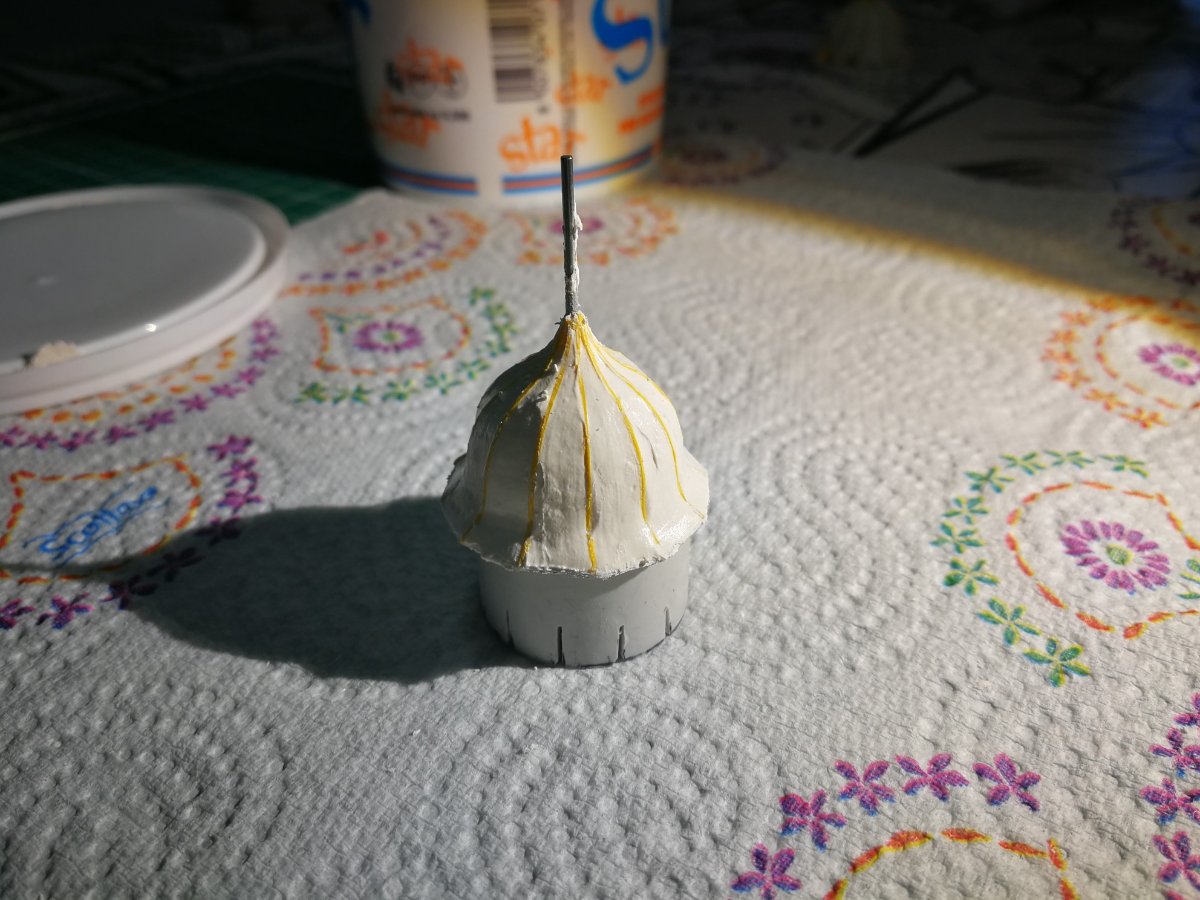Per la costruzione del cilindro ho utilizzato un pezzetto di tubo rigido per impianti elettrici del diametro appunto di 25mm, sempre con un piccolo pezzo di tubo ho realizzato la dima per la costruzione del dodecagono Come forse avete visto nel disegno pubblicato in pdf ho creato 6 elementi in pvc spessore 0,5mm per la costruzione del telaio della cupola e dopo averli piegati nella mezzeria gli ho posizionati a raggiera nella dima Terminata la raggiera ho fermato il tutto con colla in cianoacrilato, poi successivamente ho aggiunto il fondo sempre in PVC e la punta (da accorciare) in metallo, anch'essi incollati con cianoacrilato Completata la costruzione dello scheletro ho verificato le proporzioni ed ho iniziato a riempire gli spazi con stucco carteggiabile a base vinilica Per ultimo ho riverificato il risultato posizionando provvisoriamente la cupola nella posizione definitiva Ora la cupola è in essiccazione in attesa di essere rifinita e pitturata.