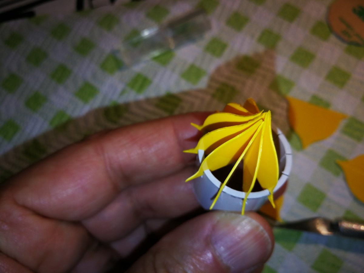 Terminata la raggiera ho fermato il tutto con colla in cianoacrilato, poi successivamente ho aggiunto il fondo sempre in PVC e la punta (da accorciare) in metallo, anch'essi incollati con cianoacrilato