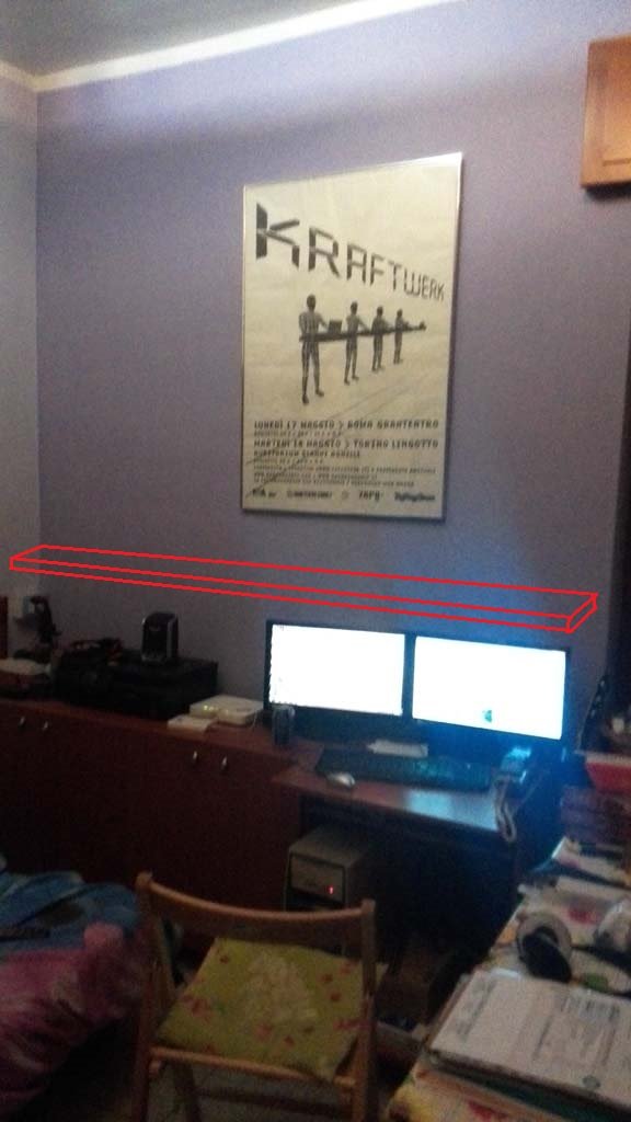 Un esempio di posizionamento della mensola che adotterei in casa mia: Le dimensioni sono di 190x 14 cm.