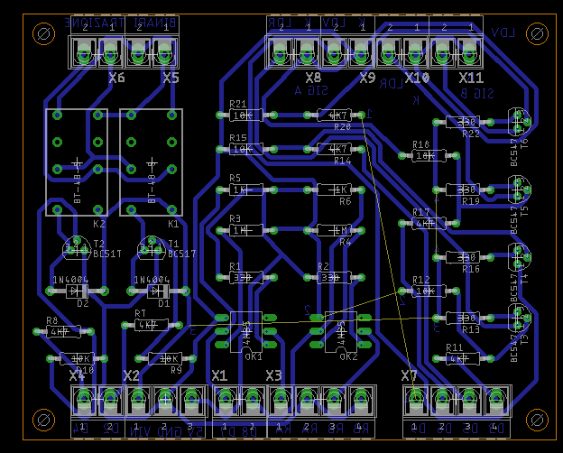 Per tale progetto ho predisposto un circuito stampato: Il cui lucido può essere scaricato qui: Nota: è necessario effettuare 4 collegamenti elettrici tramite degli spezzoni di sottile filo elettrico nei punti contrassegnati con 1-1, 2-2, 3-3 e 4-4; linee gialle. Il software non è stato scritto, perchè in realtà ho intenzione di realizzare un tracciato lievemente differente e un po' più intrigante, che si basa sempre sulla logica della linea punto a punto. Una stazione principale di testa a sinistra con 2 binari e una secondaria a destra sempre con 2 binari + una galleria cieca per simulare un raccordo.