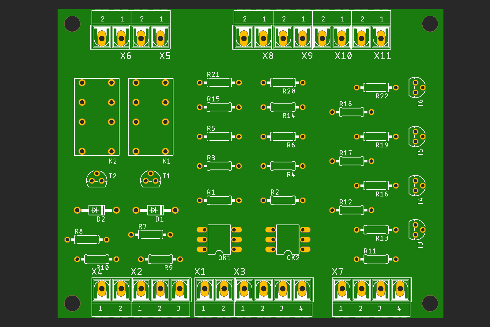 Per tale progetto ho predisposto un circuito stampato: Il cui lucido può essere scaricato qui: Nota: è necessario effettuare 4 collegamenti elettrici tramite degli spezzoni di sottile filo elettrico nei punti contrassegnati con 1-1, 2-2, 3-3 e 4-4; linee gialle. Il software non è stato scritto, perchè in realtà ho intenzione di realizzare un tracciato lievemente differente e un po' più intrigante, che si basa sempre sulla logica della linea punto a punto. Una stazione principale di testa a sinistra con 2 binari e una secondaria a destra sempre con 2 binari + una galleria cieca per simulare un raccordo.