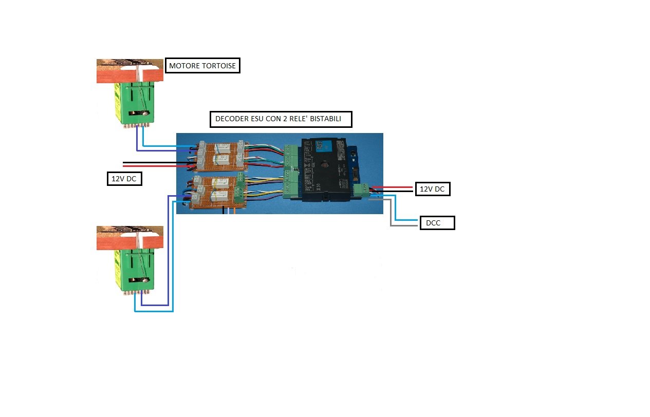 -motori Tortoise collegati a un relè bistabile che inverte la polarità di una alimentazione esterna 12V DC, pilotati dal decoder Esu che ha come input il segnale DCC e una alimentazione accessoria 12V DC.
