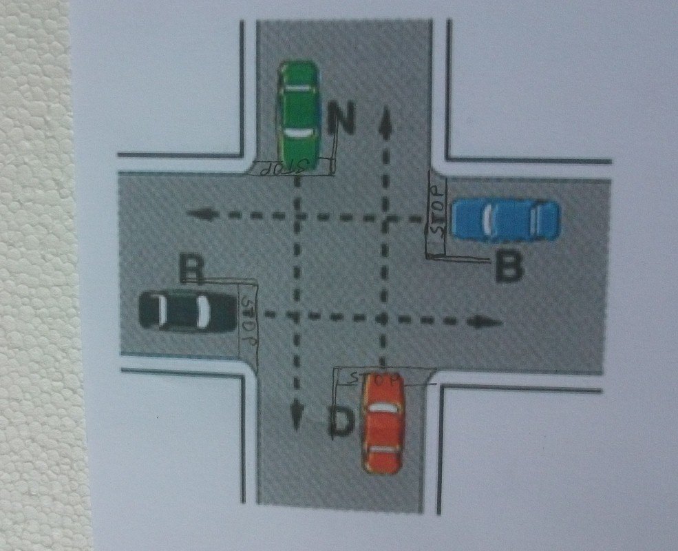 ...se tutte le auto sono fermi allo stop passeranno contemporaneamente N e D....poi passeranno B e R.. sempre chè rispettano le direzioni di marcia indicate...se invece qualcuna deve svoltare a destra o a sinistra l'ordine di precedenza in alcuni casi viene modificato :mrgreen: