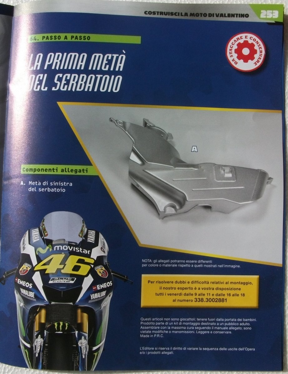 La De Agostini comincia ad essere non più tanto affidabile nelle sue raccolte, ha commesso un errore di imbustamento anche nella raccolta "La moto di Valentino", infatti nel fascicolo N°67 ha imbustato due pezzi "I", tralasciando il pezzo "H", lunedì mi toccherà telefonare per avere i pezzi giusti, oggi sono chiusi, intanto sono fermo col montaggio. [103]