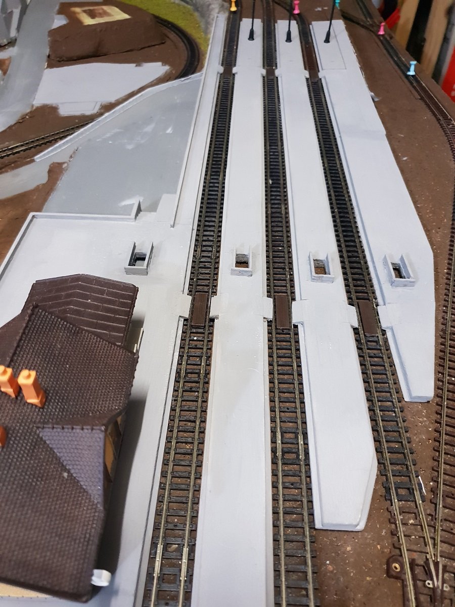1) Innalzare la parte cerchiata in azzurro nella 2à foto per portarla in piano con gli altri binari ed eliminare una parte della pensilina per farla della stessa larghezza delle altre (in azzurro 1à foto).