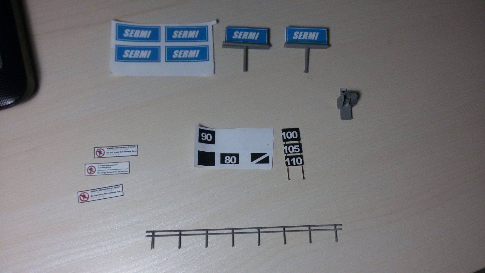 I lavori lentamente procedono. Nell'attesa della base in legno e sughero, ho sfruttato delle ore libere per dedicarmi alla costruzione di alcuni dettagli. Non sono ancora sicuro di inserirli tutti, e inoltre qualcuno ha bisogno ancora di alcune modifiche (per esempio stampare e sostituire la T sul telefono che è stata fatta a penna, oppure dare un tocco leggero di sporco "vissuto" ai cartelloni..). Ma considerando il tempo complessivo che ho impiegato per farli ed il costo irrisorio (il telefono l'ho fatto con cartoncino Bristol, i cartelloni con il nome della stazione sono stampati su carta e la base è fatta con stuzzicadenti, i segnali con la velocità sono stampati su carta ed i pali sono degli aghi da cucito...) direi che per adesso posso ritenermi abbastanza soddisfatto.