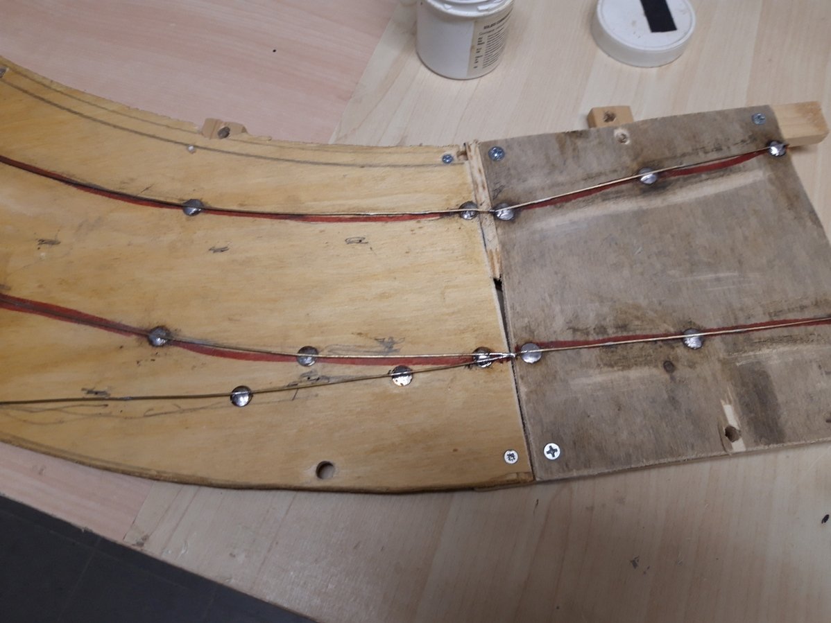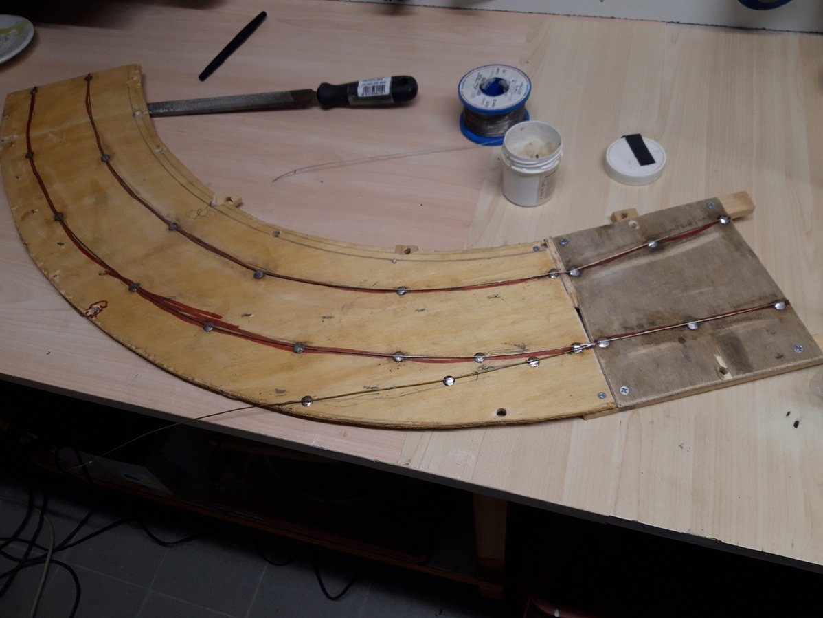 Ovviamente bisogna installarvi sotto il "guida pantografi"... Filo di ottone d. 1 mm saldato su puntine da disegno "denudate" L'attenzione da porre è nel punto di raccordo fra gli elementi dell'elicoidale. Non devono esserci "appigli" di alcun tipo.