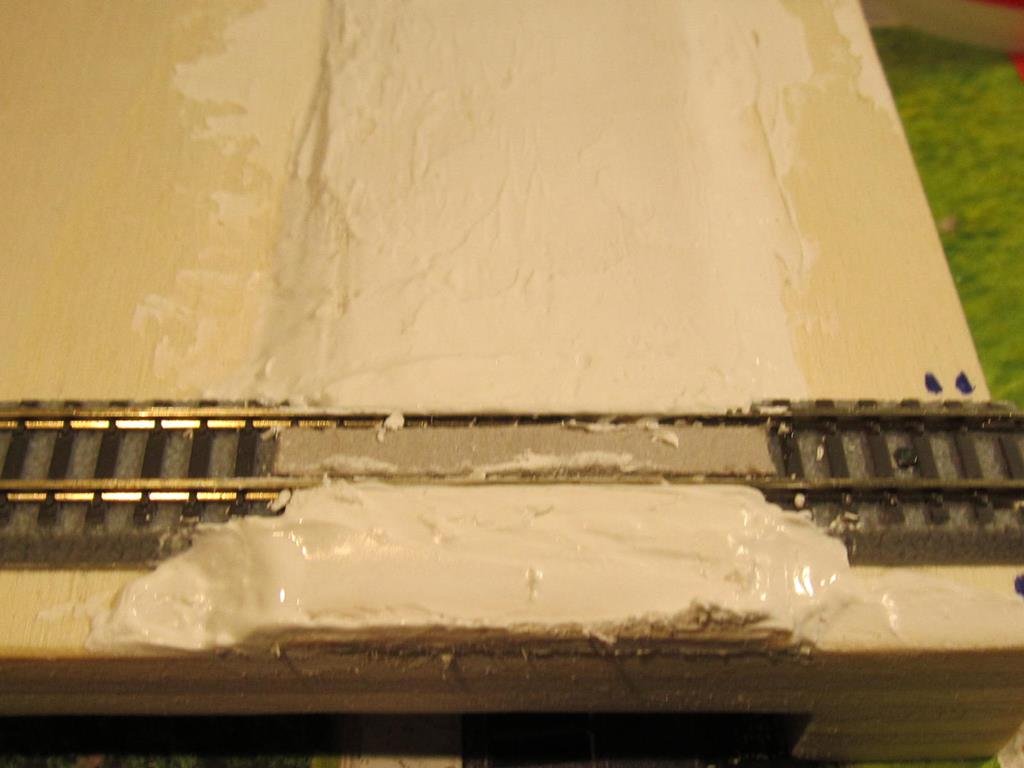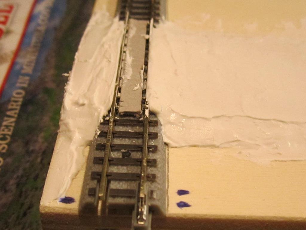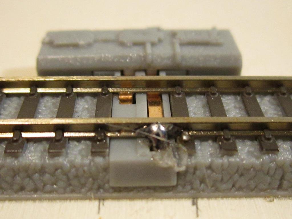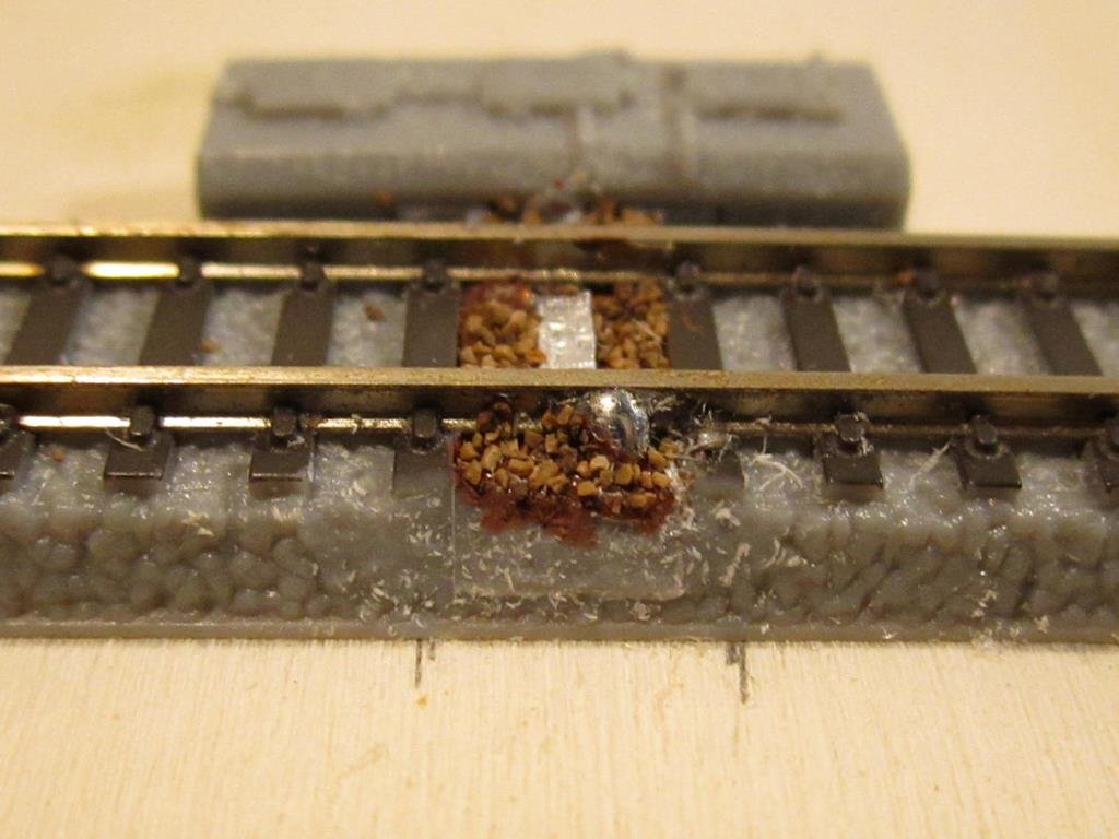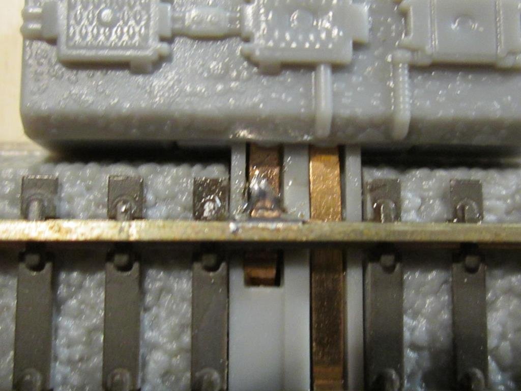 Per rimediare basta ovviamente riempire il vuoto con un po di ballast, ma previa preparazione. A questo scopo ho saldato le lamelle porta corrente alle rispettive rotaie in modo di avere un contatto permanente che non venga influenzato da colle o colori. La saldatura causa dimensioni è la posizione è stata un po laboriosa ma alla fine sono riuscito nel lavoro.