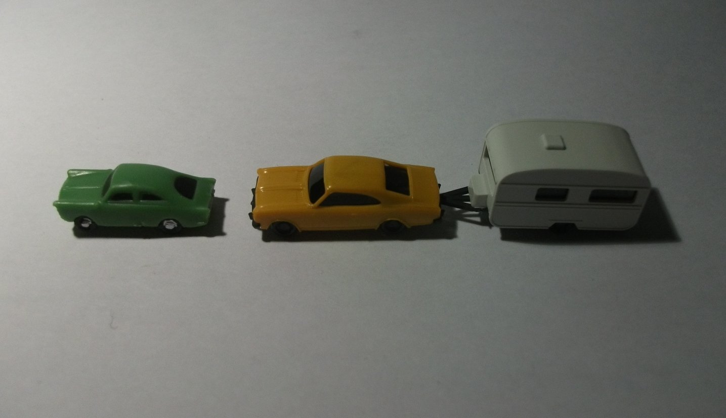 Le dimensioni dell'auto gialla (Wiking) sono 29X11 mm., mentre quelle dell'auto verde (DeA) sono 23X10 mm. e la roulotte 24X12 mm.
