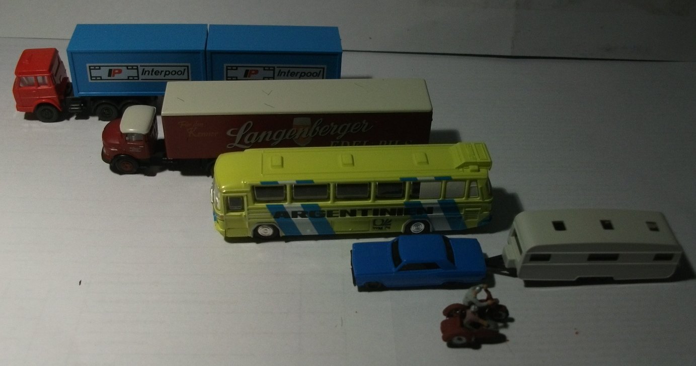 Ho voluto mettere a confronto e paragonare mezzi di diverse marche : Minitrix, Minis, Wiking e Noch, sembrano tutti e cinque conformi, proporzionati fra di loro ed anche molto più dettagliati delle macchinucce della DeA. [102]