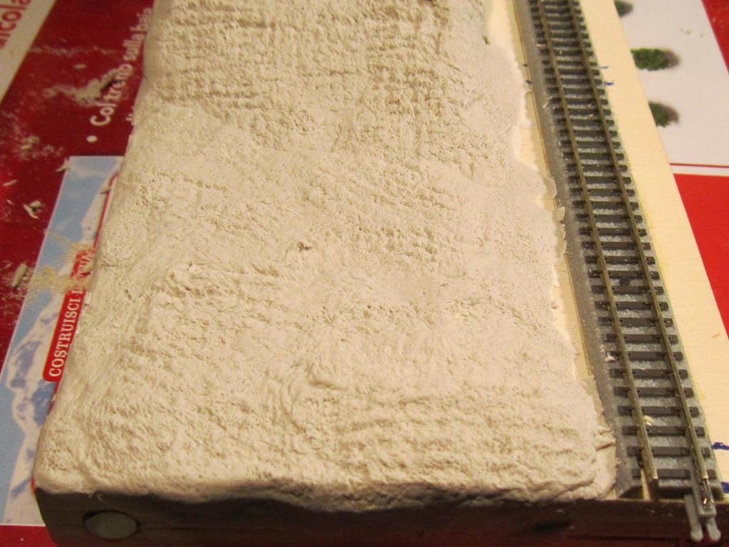 La pasta è stata stesa anche oltre ai bordi per aumentarne l'adesione al blocco di polistirolo estruso, una volta ben secca verrà carteggiata per portarla a filo.