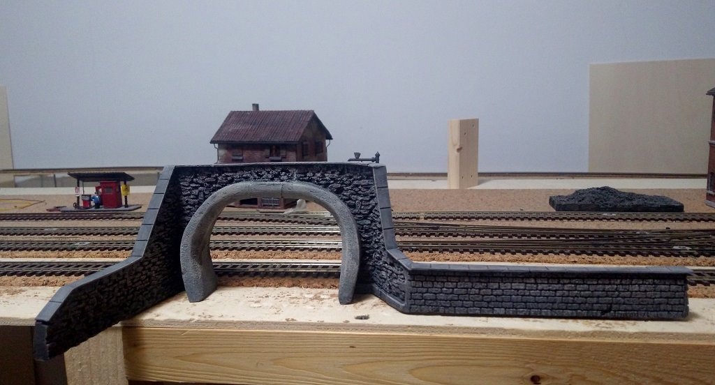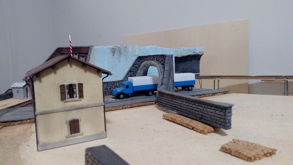 In questo caso sono partito da un prodotto commerciale Noch, più precisamente l'articolo 58290, il quale è stato elaborato in base alle mie esigenze ridotto in altezza sopra il tunnel ed allargato per adattarlo alla strada, con gli scarti ho ricavato i muri laterali, un ulteriore avanzo di muretto e un po' di Forex hanno terminato la struttura.