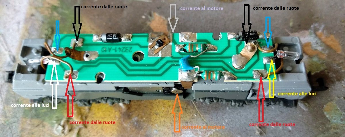 Si sono fusi e staccati, dal decoder, i due fili rosso e grigio, cioè quello che prende corrente dalla ruota da un lato e quello che porta corrente al motore dal lato opposto.