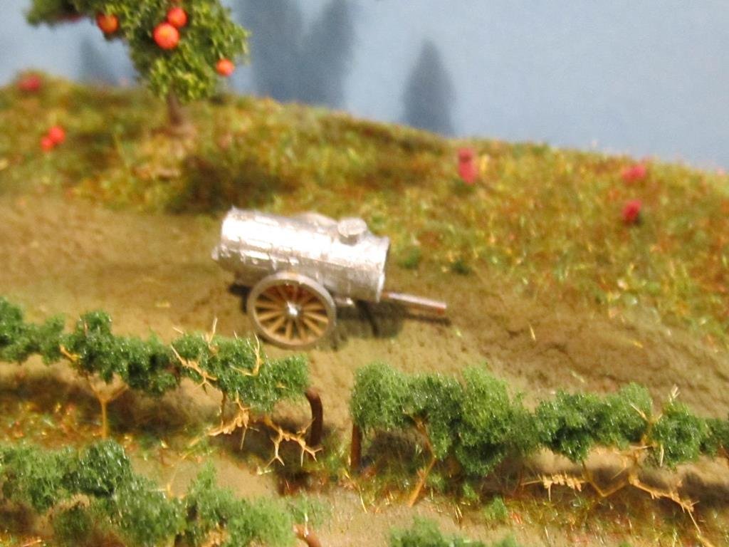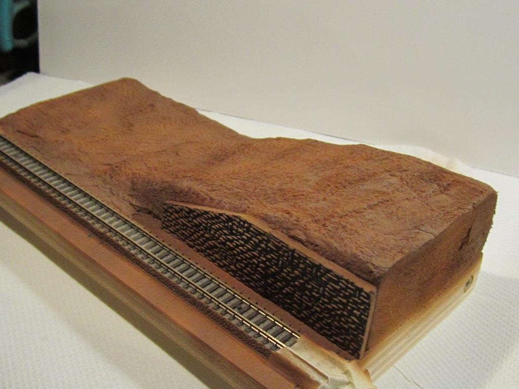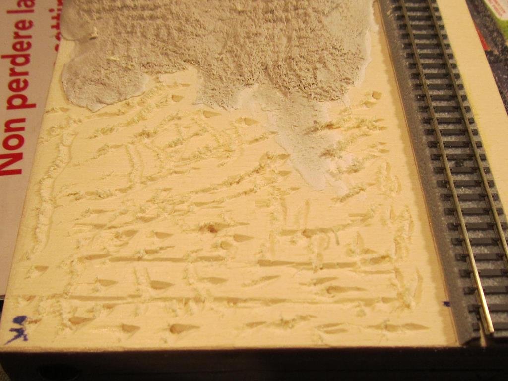 Iniziato la preparazione del terreno, dopo aver fatto le canoniche intagliature sulle superfici sia in legno che polistirolo estruso per fare aderire meglio la sfoglia di pasta DAS è stata stesa la sfoglia comprimendola con le mani in modo non uniforme. Per eliminare le ditate la sfoglia è stata testurizzata tramite uno spazzolino odontoiatrico per ricavarne una superficie ruvida ad imitazione del terreno. Utilizzare una pasta per scultura a cui una volta stesa verrà resa la superficie ruvida evita quel effetto poco estetico che fanno le varie ghiaie o granulati per ricreare i terreni nelle scale più piccole, poco realistico in proporzione ai figurini sia umani che animali facendo risultare il terreno abnorme come se si camminasse su una pietraia.
