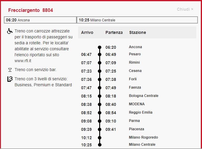 Foto: https://www.ilportaledeitreni.it/2019/0 ... kFwmemP37s Il treno, primo ETR 700 in servizio commerciale, è partito da Ancona alle 5:00 ed è giunto a Milano Centrale alle 9:08, con due minuti di anticipo. Il treno ha fermato a Pesaro, Rimini, Cesena, Forlì, Faenza, Bologna, Modena, Reggio Emilia, Parma, Piacenza e Milano Rogoredo.