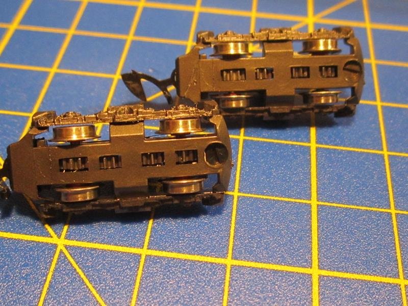 Nelle loco diesel/ elettriche a carrelli il punto ideali di inserzione è sul retro dei carrelli vicino alla cassa batterie , basta inserire i dilatatori tra telaio e cassa uno su un lato è l'altro su quello opposto, una volta allargate di quel poco le fiancate afferrando un carrello esattamente al centro applicheremo una leggera forza verso il basso per sfilare il telaio.