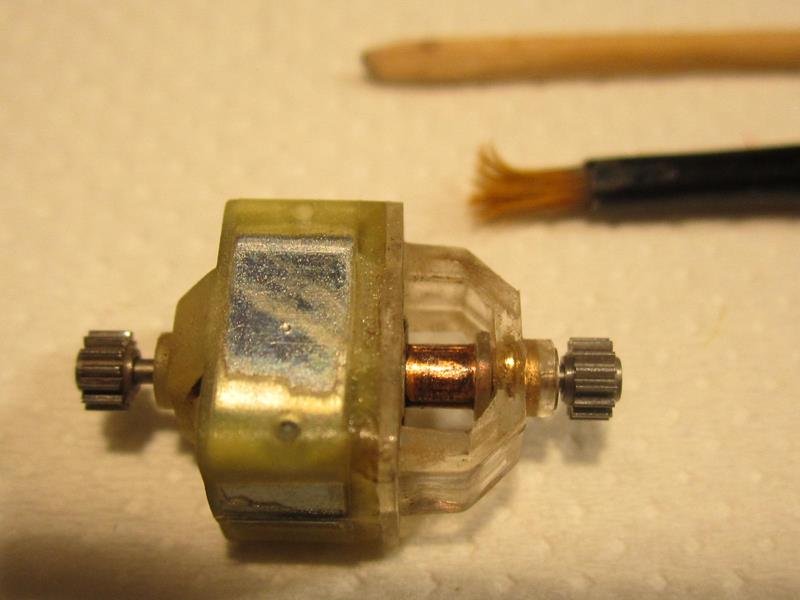 Estraiamo il motore ancora umido dal vasetto è puliamo l'indotto con un pennello ( in genere i residui vengono via facilmente , altrimenti ripetiamo ancora un passaggio in lavatrice ) , se lo sporco persiste possiamo sfregare delicatamente l'indotto con uno stuzzica denti a cui una punta è stata sagomata a lama, mentre con la punta puliamo i due piccoli solchi.