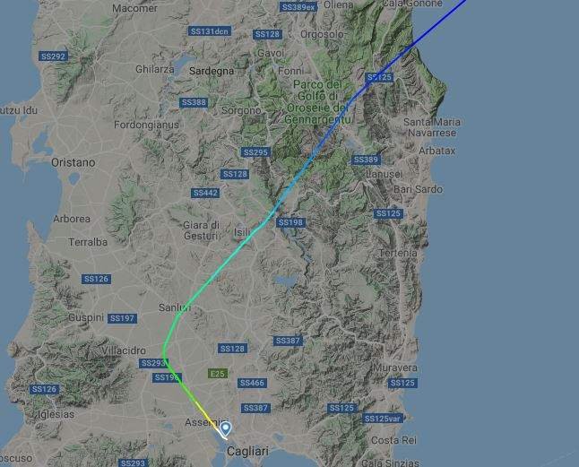 Le rotte per Cagliari sono essenzialmente due, quella per la pista 14 e quella per la pista 32. Percorriamo la rotta per la pista 14, quella che prevede l'arrivo da nord ed il sorvolo della parte sud-occidentale della Sardegna. Dopo circa 30 minuti di volo giungiamo infatti sopra il Golfo di Orosei, che si distingue chiaramente da bordo. Procediamo poi in direzione sud-ovest e sorvoliamo i monti del Gennargentu, sui quale si riconoscono i numerosi laghi artificiali presenti in quest'area, tra i quali quelli del Flumendosa e Mulargia. Compiamo una virata a sinistra ed iniziamo la discesa verso Cagliari, sorvolando tutta la pianura del Campidano. Atterriamo sulla pista 14 dell'aeroporto di Cagliari Elmas alle 14:25, con 5 minuti di ritardo.
