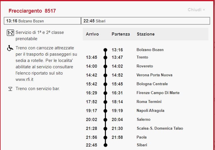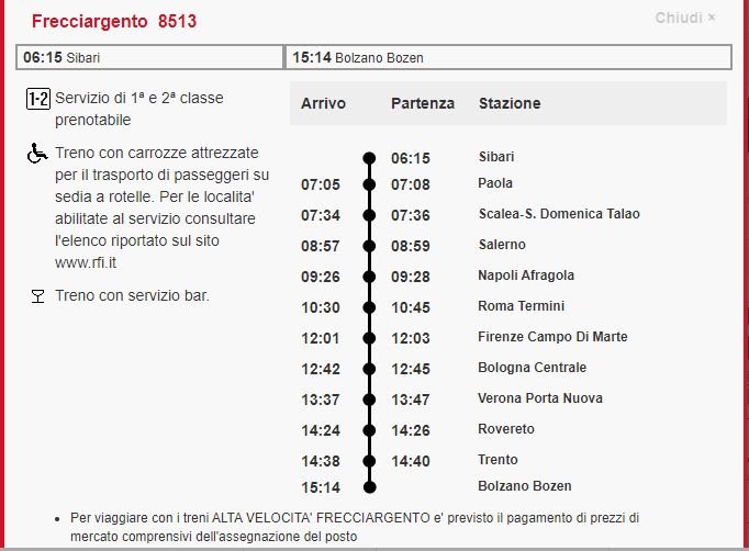 Detto questo non sono un gran sostenitore dei collegamenti "punto-punto" tipo il Bolzano-Sibari, ma sono più per l'avere una fitta ed efficiente rete di servizi locali. Questo treno è uno ed uno solo, quindi o ti va bene a quell'ora o niente, mentre una efficiente rete di servizi locali consente di avere molte più possibilità di scelta in coincidenza con i servizi ad alta velocità che partono dai principali centri.