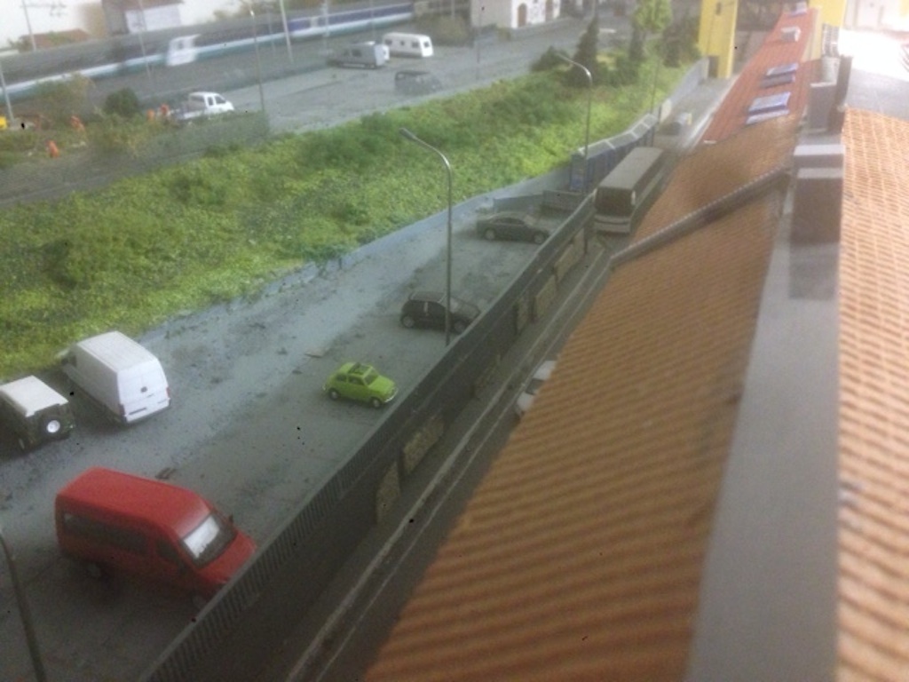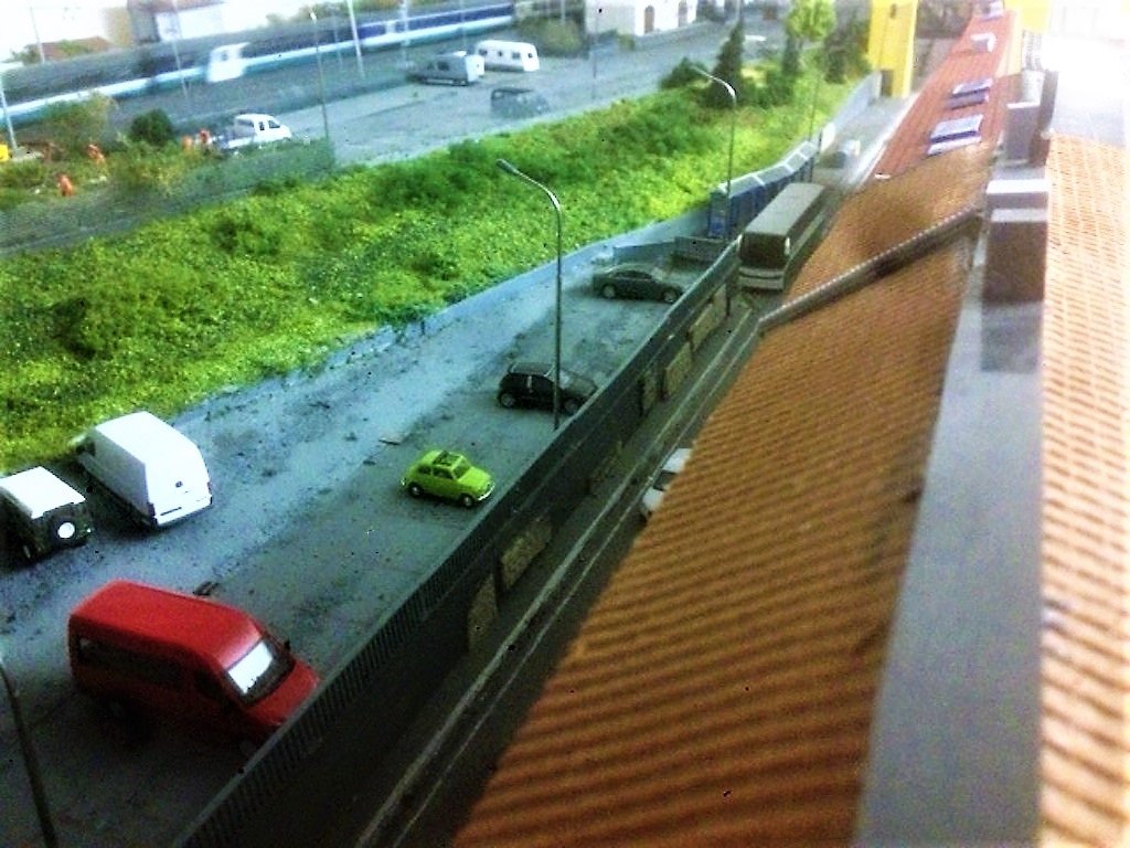 Attenzione però: il fondale è un plastico su due dimensioni. Occorre giocare di pennello e colori, foto disegni e fare un collage che crei l'effetto prospettico tridimensionale e moltiplichi la profondità scenografica del plastico, valorizzandone la scenografia reale del plastico!