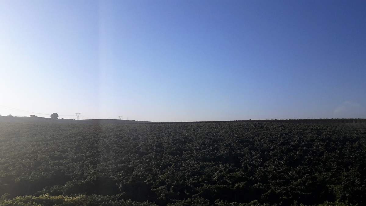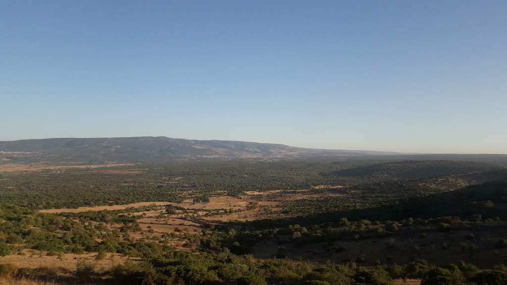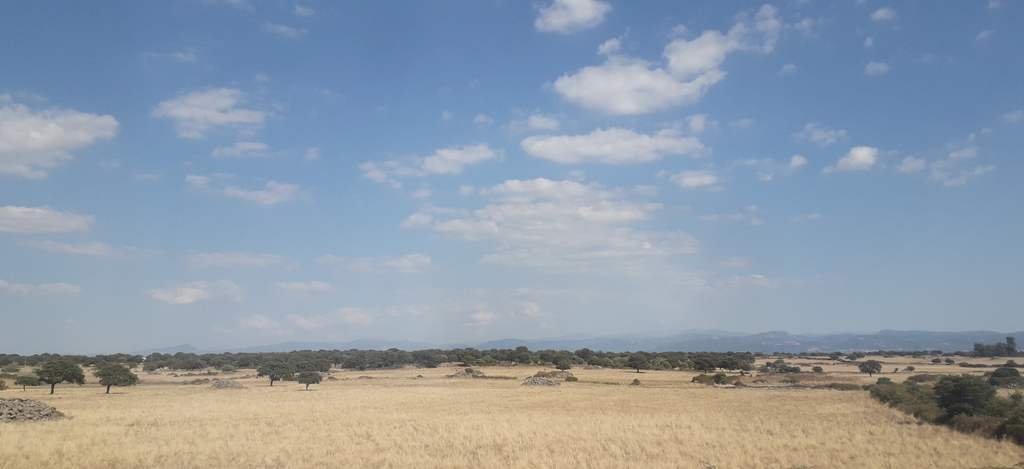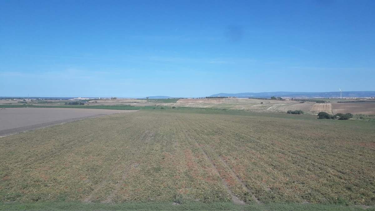 Partiamo in orario alle 13:33 e ci mettiamo in marcia verso Monti e Berchidda. La ferrovia transita in un ambiente prevalentemente collinoso, che diviene più secco ed arido mano a mano che ci spingiamo verso l'interno dell'isola. Verdeggianti coltivazioni di vite ed olivo nei pressi di Olbia lasciano il posto ad aree con poche infrastrutture e poche costruzioni, in un ambiente dominato prevalentemente da ampi spazi aperti incolti con alberi di sughero, olivo e coltivazioni di grano. La giornata è abbastanza calda e soleggiata e le temperature crescono mano a mano che ci inoltriamo verso il centro dell'isola, lontano dalle correnti che rendono più piacevole il clima sulle coste.